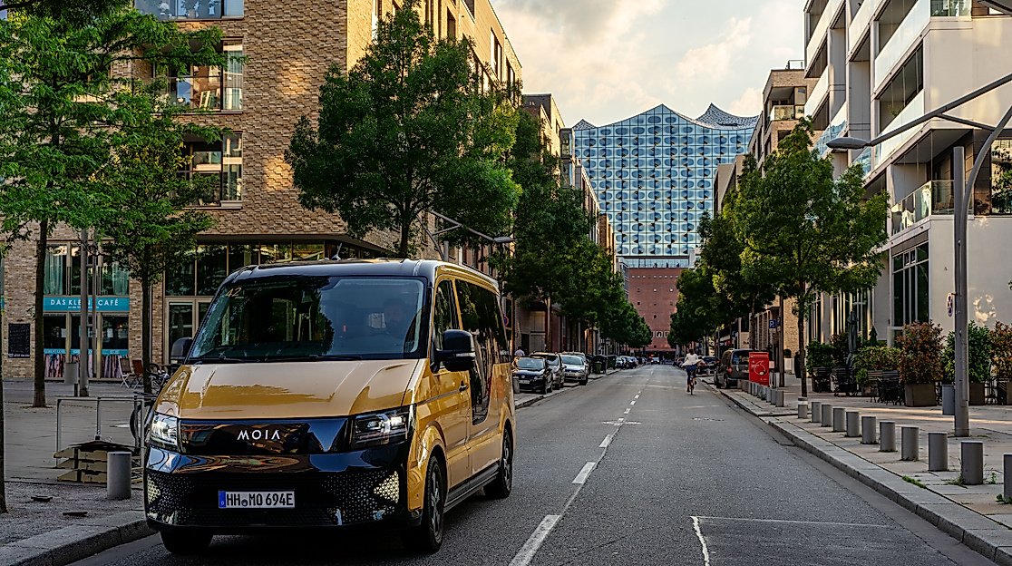 MOIA ist ein vollelektrischer Ridesharingservice in Hamburg, der den öffentlichen Nahverkehr ergänzt. Bis zu 6 Personen können sich die Fahrt in einem MOIA teilen, viel Beinfreiheit und Privatsphäre inklusive. Kinder bis 14 Jahren fahren in Begleitung eines Erwachsenen kostenlos mit. An Bord gibt es kostenloses WLAN und USB-Ports. Ein Algorithmus rechnet die optimale Fahrtroute aus und bringt dabei Fahrgäste zusammen, die in die gleiche Richtung wollen. Seit Januar 2023 ist MOIA erstmalig als eigenwirtschaftlicher Linienbedarfsverkehr Teil des öffentlichen Nahverkehrs in Hamburg. Damit leistet der Ridepooling-Anbieter mit der Genehmigung den ersten Beitrag zur Erreichung des Hamburg-Taktes für eine nachhaltige Mobilitätswende.