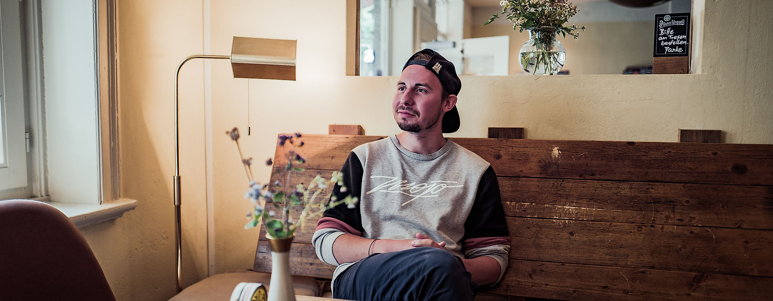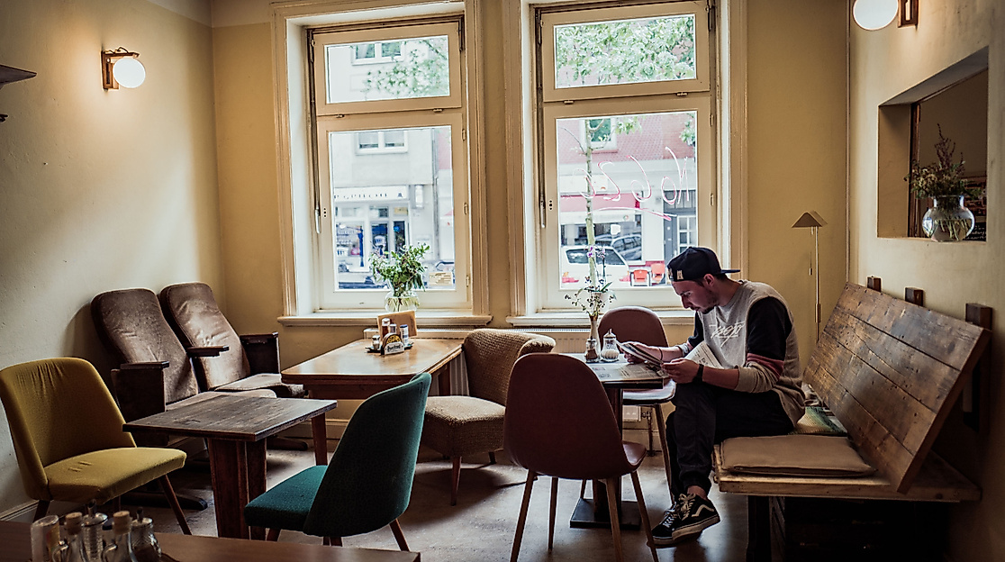Die Deichdiele in Wilhelmsburg ist eine von Jans liebsten Anlaufstellen, weil das Café nicht auf hip macht, sondern ehrlich und grundgemütlich ist. Deswegen fläzt er sich auch gleich in eine sehr einladende Ecke und bestellt sich erstmal einen Kaffee.