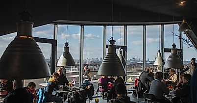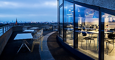 Das Café vju befindet sich in 30 Metern Höhe im Energiebunker in Wilhelmsburg und bietet seinen Gästen von einer 360°-Aussichtsterasse einen eindrucksvollen Panoramablick auf die Stadt.